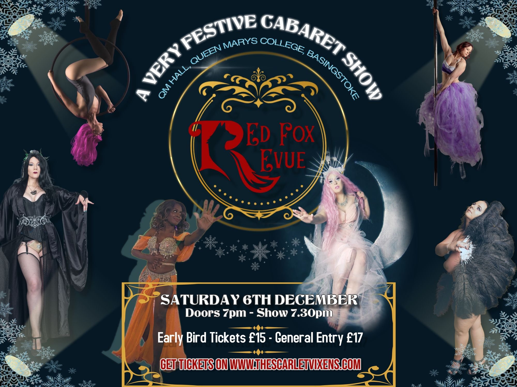 Join us for a thoroughly festive night of breath-taking burlesque, jaw-dropping aerials, side splitting comedy, beautiful belly-dance and sensational vocals in the stunning QMC Hall at Queen Mary's College.